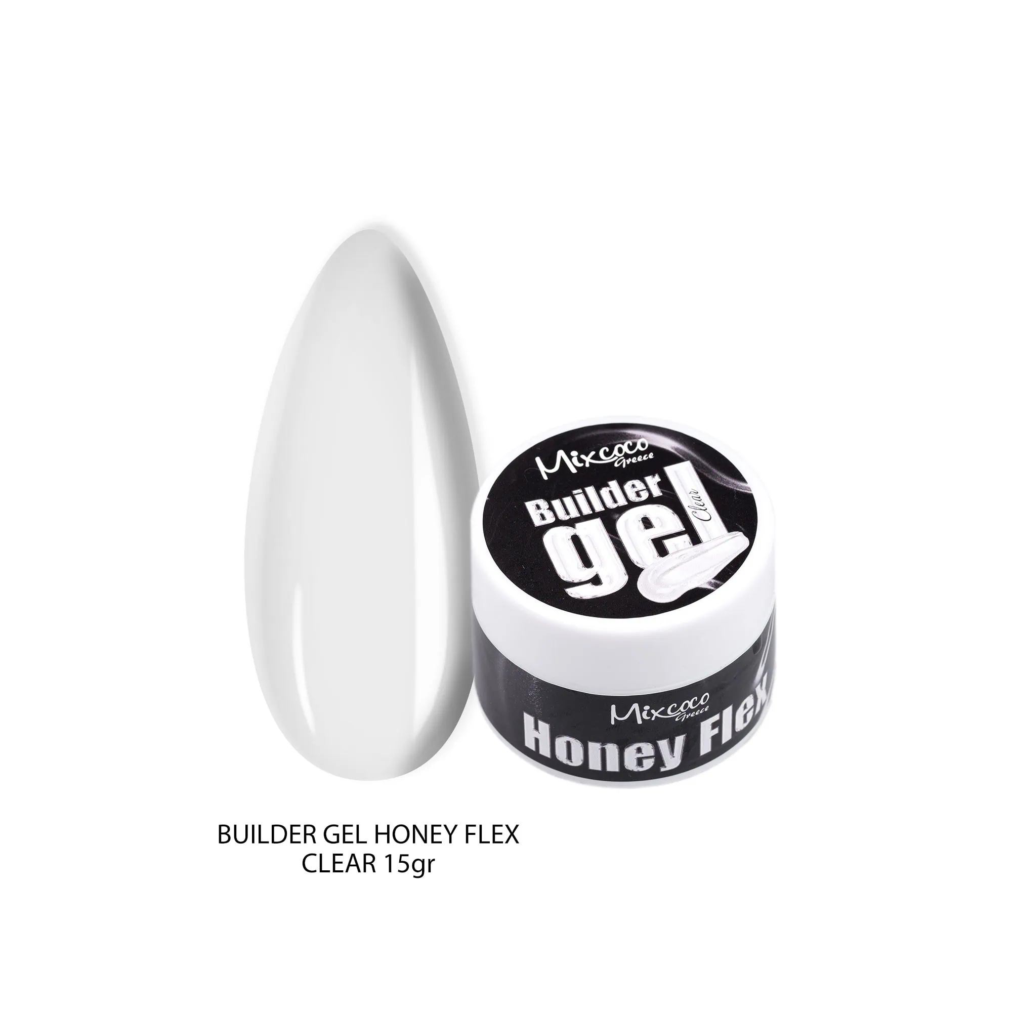 BUILDER GEL CLEAR 15gr MIXCOCO. Ελαφρώς παχύρευστο, μονοφασικό, διάφανο gel μεγάλης αντοχής. Εντελώς διάφανο με κρεμώδη υφή, δουλεύεται εύκολα και χάρη στην παχύρευστη σύνθεσή του μπορούμε να δουλέψουμε σε πάνω από 1 νυχάκι ταυτόχρονα, πριν τον πολυμερισμό. Είναι κατάλληλο για αρχάριους αλλά και για προχωρημένους τεχνίτες γιατί δεν «τρέχει» μειώνοντας έτσι το χρόνο τοποθέτησης. Ιδανικό για επιμήκυνση αλλά και για ενίσχυση του φυσικού νυχιού. Πολυμερίζεται άψογα σε UV⁄LED λάμπες πολυμερισμού για 60”. Λιμάρεται και διαμορφώνεται εύκολα. Δημιουργεί ισχυρή συγκόλληση με το φυσικό νύχι. Διατίθεται σε βαζάκια των 15gr, 30gr και 50gr.