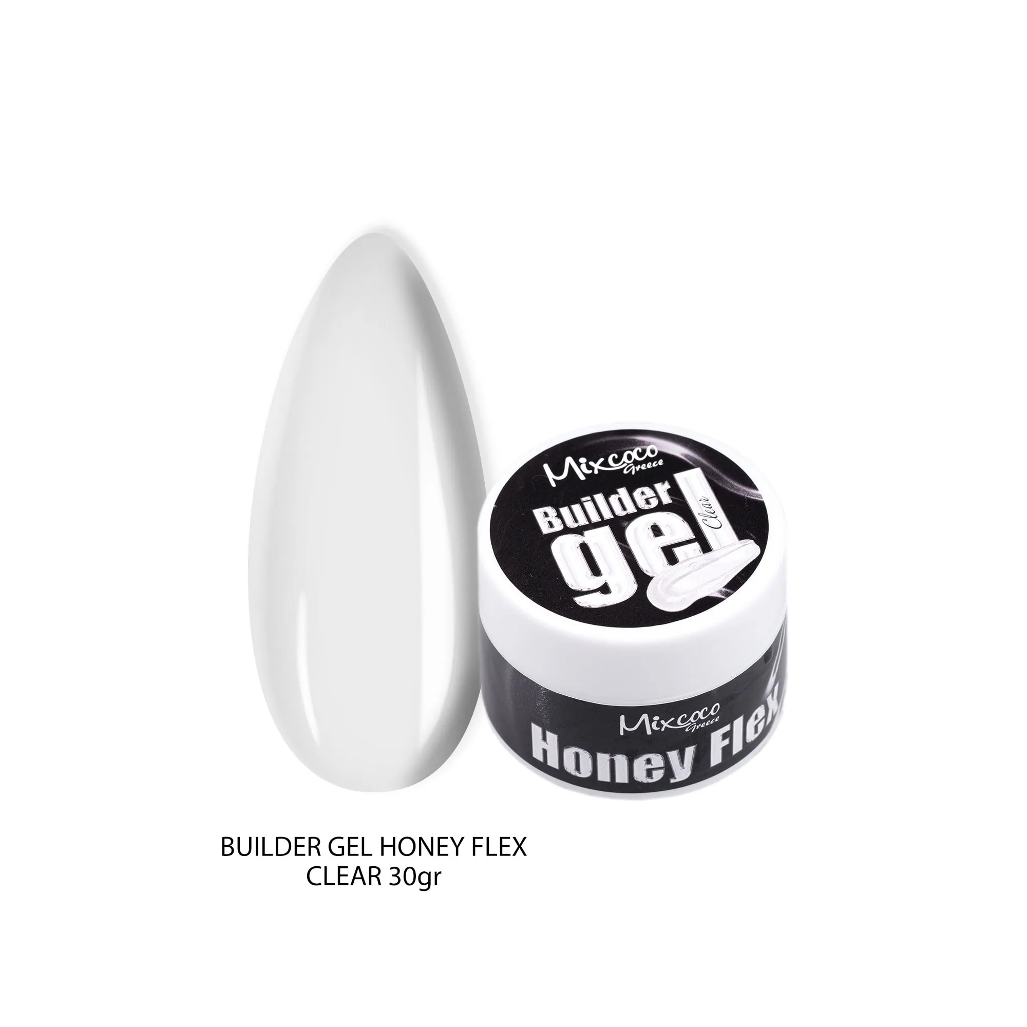BUILDER GEL CLEAR 30gr MIXCOCO. Ελαφρώς παχύρευστο, μονοφασικό, διάφανο gel μεγάλης αντοχής. Εντελώς διάφανο με κρεμώδη υφή, δουλεύεται εύκολα και χάρη στην παχύρευστη σύνθεσή του μπορούμε να δουλέψουμε σε πάνω από 1 νυχάκι ταυτόχρονα, πριν τον πολυμερισμό. Είναι κατάλληλο για αρχάριους αλλά και για προχωρημένους τεχνίτες γιατί δεν «τρέχει» μειώνοντας έτσι το χρόνο τοποθέτησης. Ιδανικό για επιμήκυνση αλλά και για ενίσχυση του φυσικού νυχιού. Πολυμερίζεται άψογα σε UV⁄LED λάμπες πολυμερισμού για 60”. Λιμάρεται και διαμορφώνεται εύκολα. Δημιουργεί ισχυρή συγκόλληση με το φυσικό νύχι. Διατίθεται σε βαζάκια των 15gr, 30gr και 50gr.
