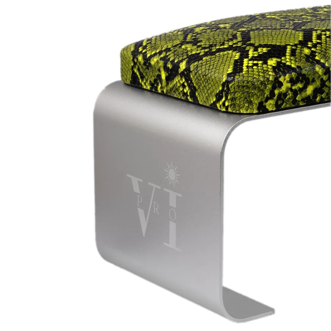 VI PRO ELITE MANI STAND GREEN SNAKE Η απόλυτη έκπληξη στον εξοπλισμό μανικιούρ! Το νέο Stand μανικιούρ της Vi Pro είναι ό,τι καλύτερο μπορείς να έχεις στον πάγκο σου! Με βάση από ανοδιωμένο αλουμίνιο πλήρως προστατευμένο από την οξείδωση, εξαιρετικά κομψό και φουτουριστικό design. Με αρκετό κενό για να χωρά κάθε λάμπα πολυμερισμού στο κάτω μέρος του με άνεση και ειδικά αντιολισθητικά πατάκια σιλικόνης ώστε να μη μετακινείται κατά τη διαδικασία της παροχής. Το μαξιλαράκι του που είναι ντυμένο με εξαιρετικής ποιότητας γνήσιο δέρμα, ενώ ο εργονομικός του σχεδιασμός, το καθιστά μέρος ενός high-end εξοπλισμού. Το design με δέρμα φιδιού σε πράσινο χρώμα στο μαξιλάρι του, εκτοξεύει την αισθητική του Stand σε Elite επίπεδο!! Προσφέρει άνεση, ξεκούραση και έχει το ιδανικό ύψος τόσο για την πελάτισσα που δε θα κουραστεί, όσο και για τον επαγγελματία που θα έχει το χέρι του πελάτη στο ιδανικό ύψος, ώστε να αποφύγει τα χρόνια αυχενικά σύνδρομα. Δώστε στις πελάτισσές σας αυτό που τους αξίζει, με την άνεση του VI Pro Elite Mani Stand και αναβαθμίστε τις υπηρεσίες και τον χώρο σας! Διατίθεται σε 4 χρωματισμούς: Λευκό, Μαύρο, Πράσινο Snake Skin και Ροζ Snake Skin.